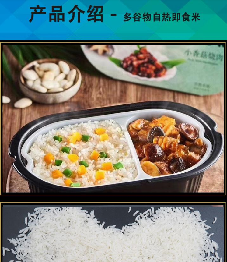 開水沖泡型:如千石谷等,便于攜帶、儲藏,米粒香糯,五谷米飯種類多;細分可分為速煮米和纖維餐。脫水干燥型:經(jīng)過脫水干燥的米飯顆粒,在食用時覆水(加開水浸泡)數(shù)分鐘即可食用,分自熱型如廚師、得益;